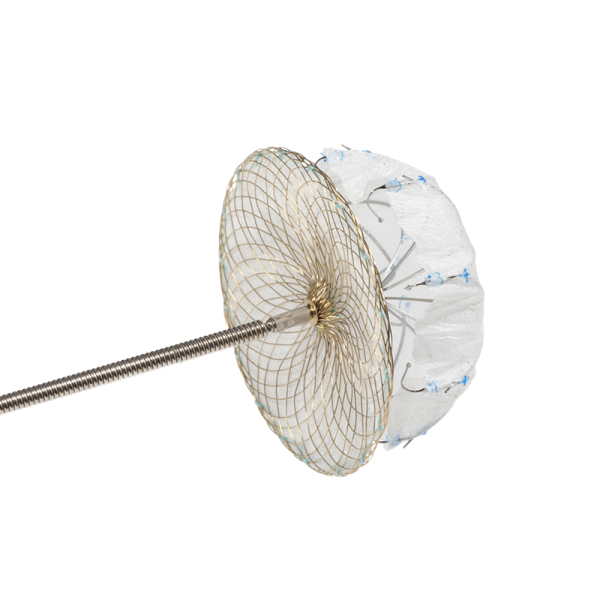 本產品由固定盤和密封盤組成,固定盤和密封盤由連接鋼套連接。固定盤是由鎳鈦合金材料構成的骨架,骨架舉有彈性。在骨架上設有固定錨,固定錨刺入左心耳壁,以固定器材在左心耳上。密封盤是由鎳鈦合金絲構成的彈性支撐鋼盤,密封盤的近端裝有連接螺絲,輸送鋼纜和連接螺絲連接,輸送鋼纜通過輸送鞘管把本產品輸送到預定部位。固定盤和密封盤都縫有阻流膜。